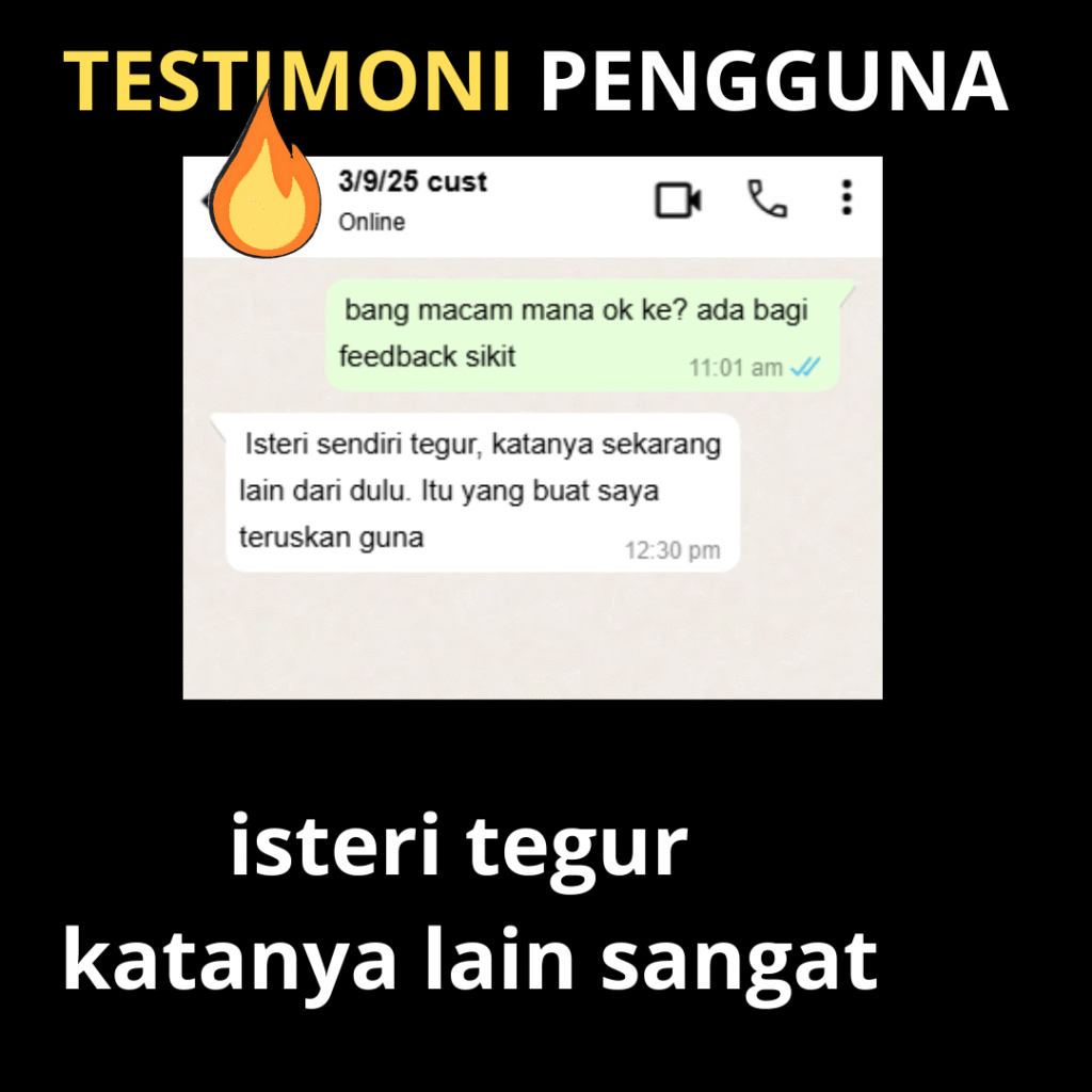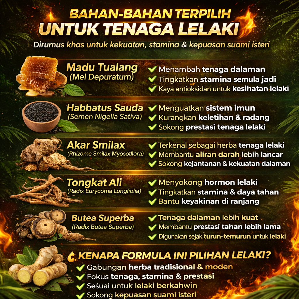 Ia tidak mengandungi bahan terlarang dan sesuai diambil sebagai suplemen sokongan tenaga & prestasi dalaman lelaki apabila diambil mengikut dos yang disarankan.